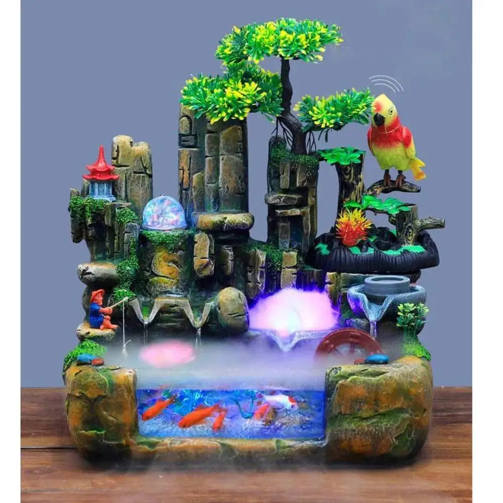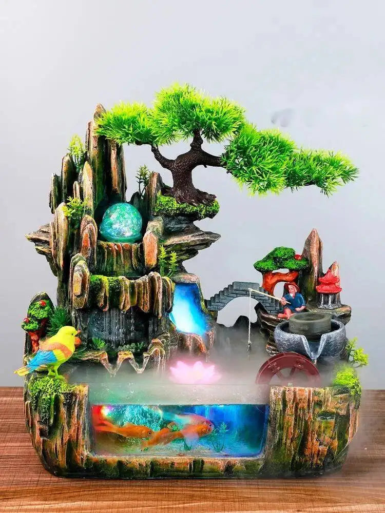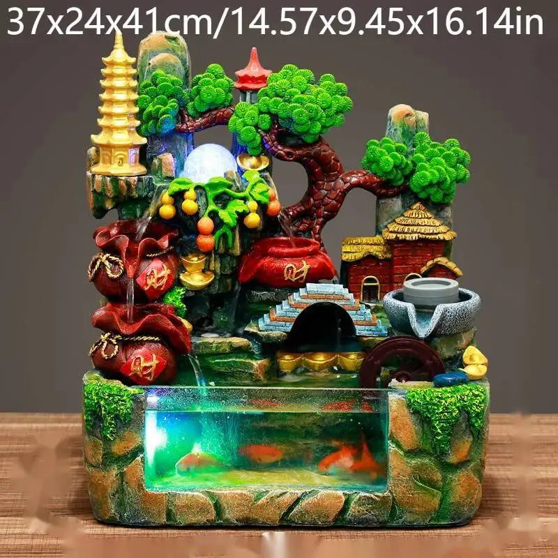Rocky Mountain Waterfall Fountain with Flowing Water and Feng Shui Wheel – Small Fish Tank Decor for Living Room with Circulating Design